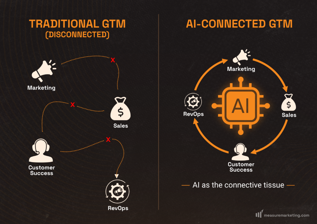 The result is a GTM model in which teams work hard but operate without the shared intelligence needed to generate predictable revenue. AI helps address this not by replacing these teams, but by strengthening the connective tissue between them.